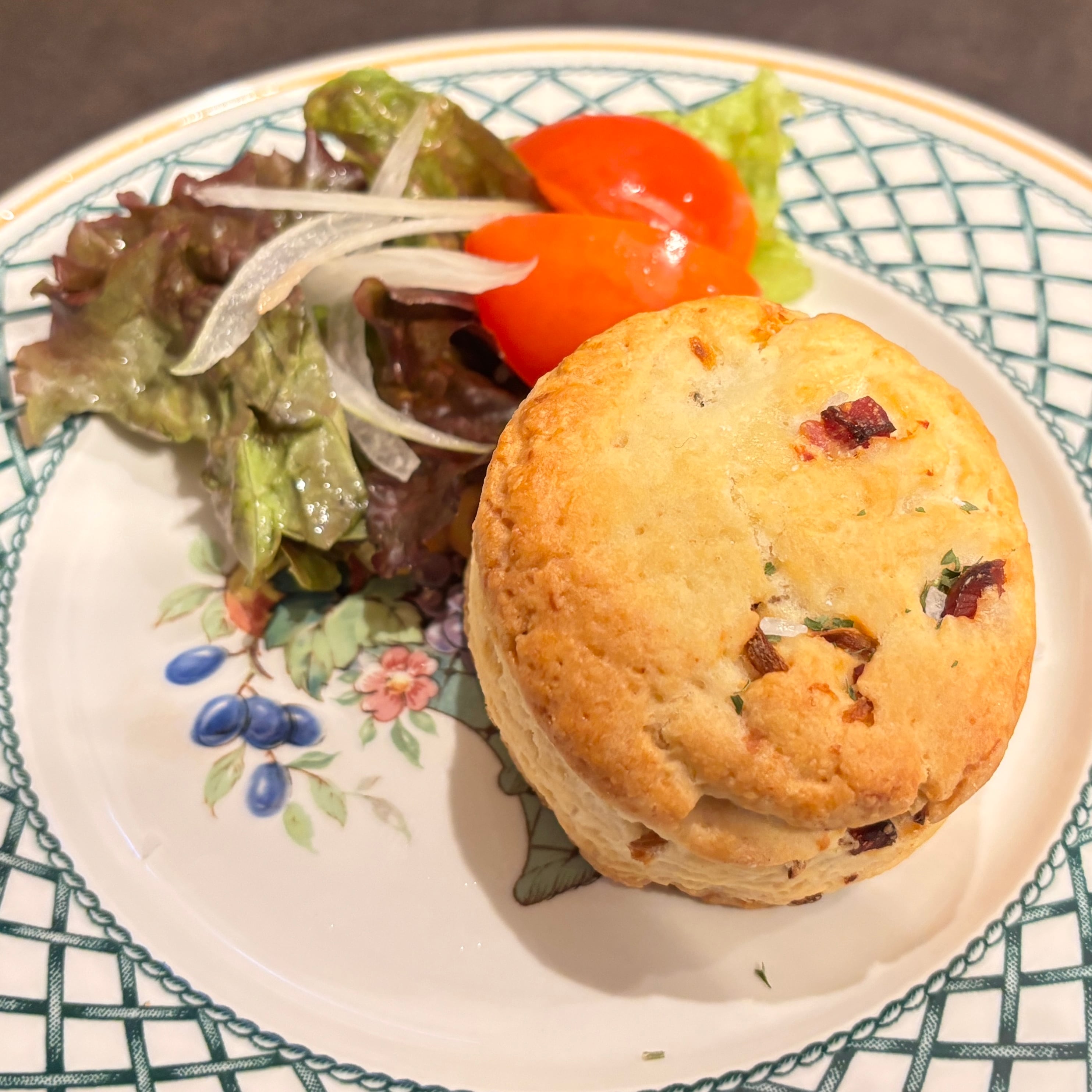 ●ベーコンチーズスコーン・・・スコーン生地にベーコン、チーズ、フライドオニオンを混ぜ込んでオリーブオイル、岩塩を乗せて焼き上げました。しっとりサクサクスコーンにベーコンとチーズの塩味を感じるスコーンでサラダやクリームチーズと一緒に朝食で召し上がっていただくのもおすすめです。