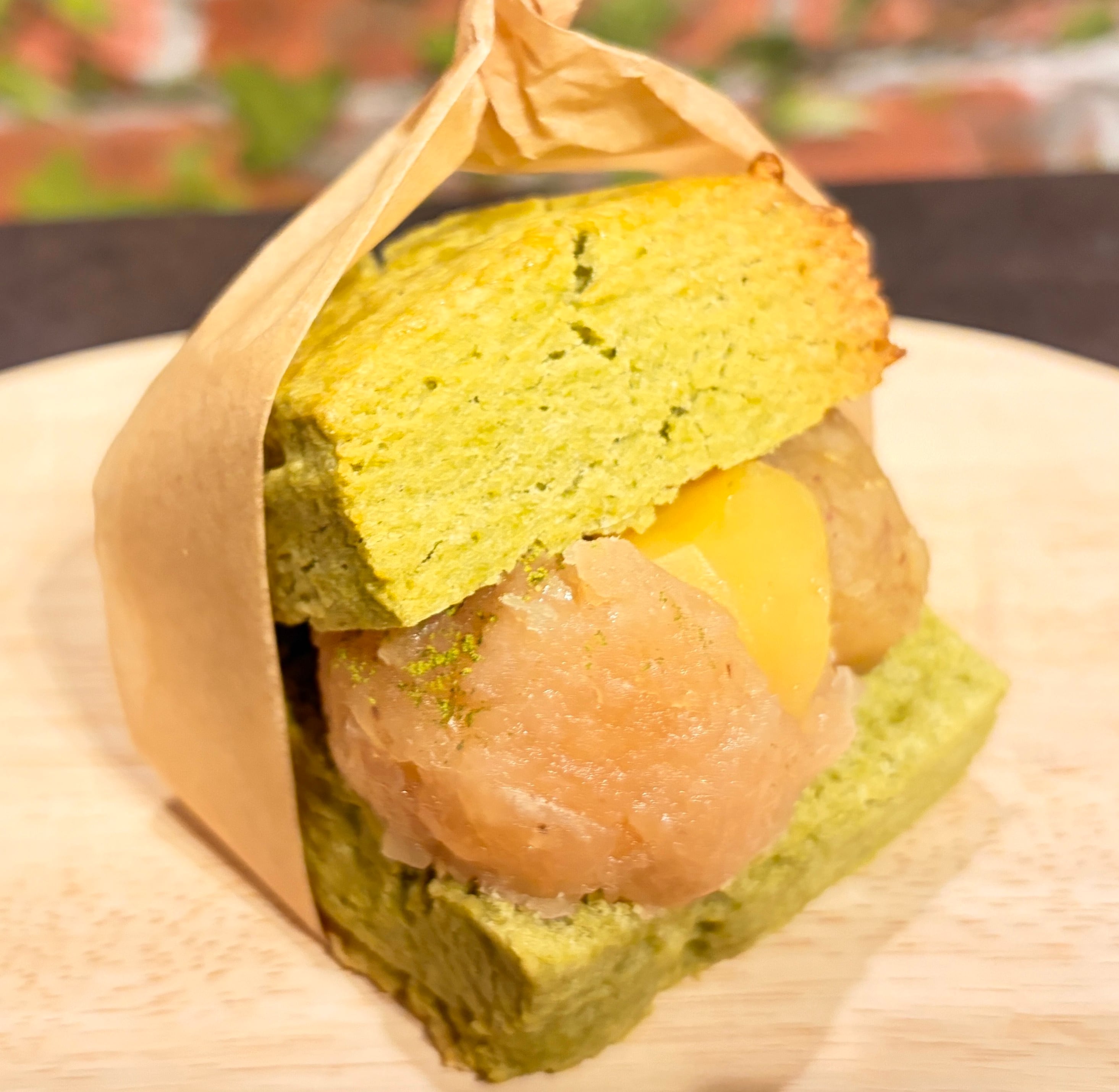 ●栗抹茶あんスコーンサンド・・・プレーンスコーン生地に栗の甘露煮と抹茶あん、ぎゅうひをサンドしました。しっとりさくさくスコーンに栗の味わいにぎゅうひの食感がおもしろい和のスコーンサンドです。