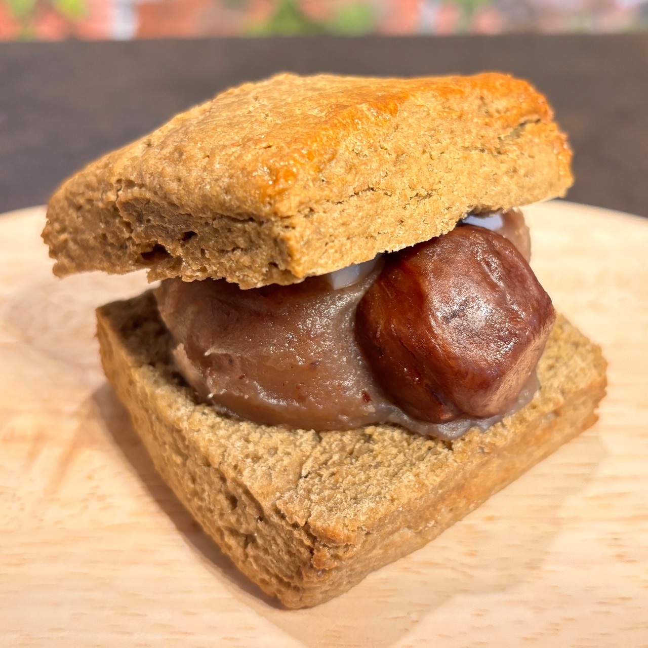 ●ほうじ茶栗あんバタースコーンサンド・・・ほうじ茶スコーン生地に和栗あん、有塩グラスフェッドバター、栗の渋皮煮をサンドしました。ほうじ茶の本格的な風味に栗とあんバターの味わいがたまらないスコーンサンドです。