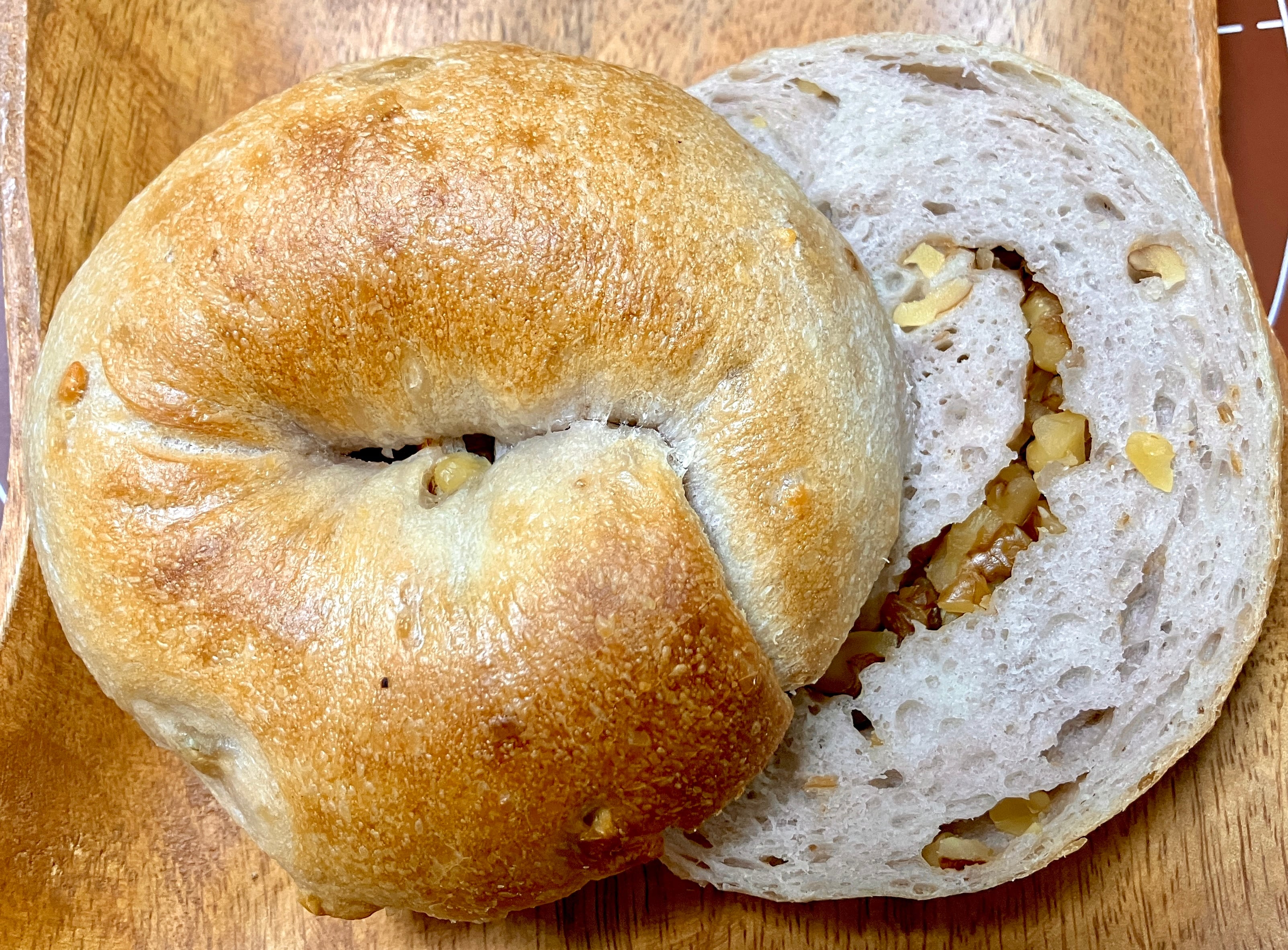 ●くるみ全粒粉・・・全粒粉を配合した生地にくるみを混ぜ込み巻き込んだゴロゴロくるみのうまみがたまらないベーグルです。