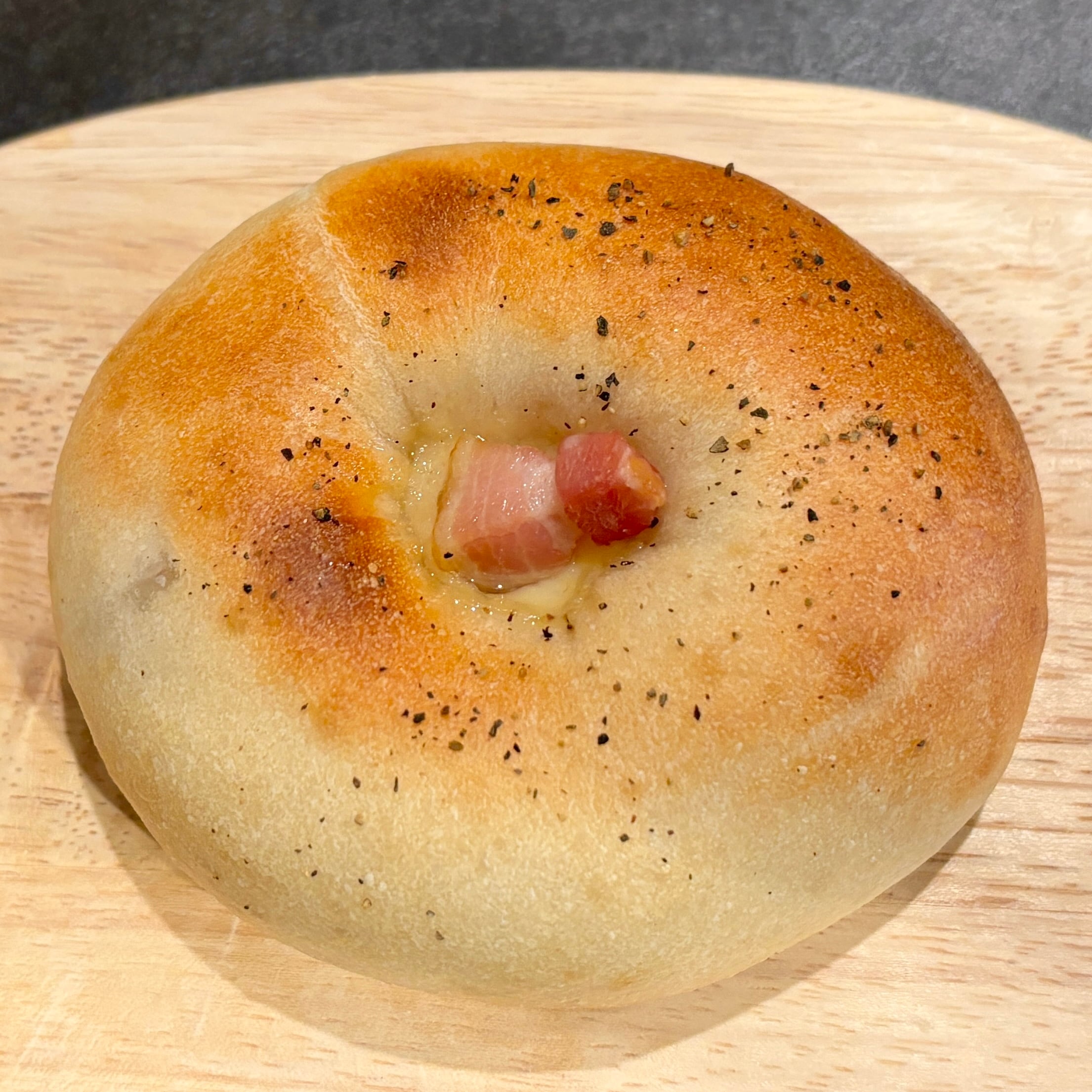 ●ベーコンチーズ・・・プレーン生地に国産ベーコンとサイコロチーズを巻き込みました。ジューシーなゴロゴロベーコンととろけるチーズ、黒胡椒が相性抜群のお惣菜ベーグルです。