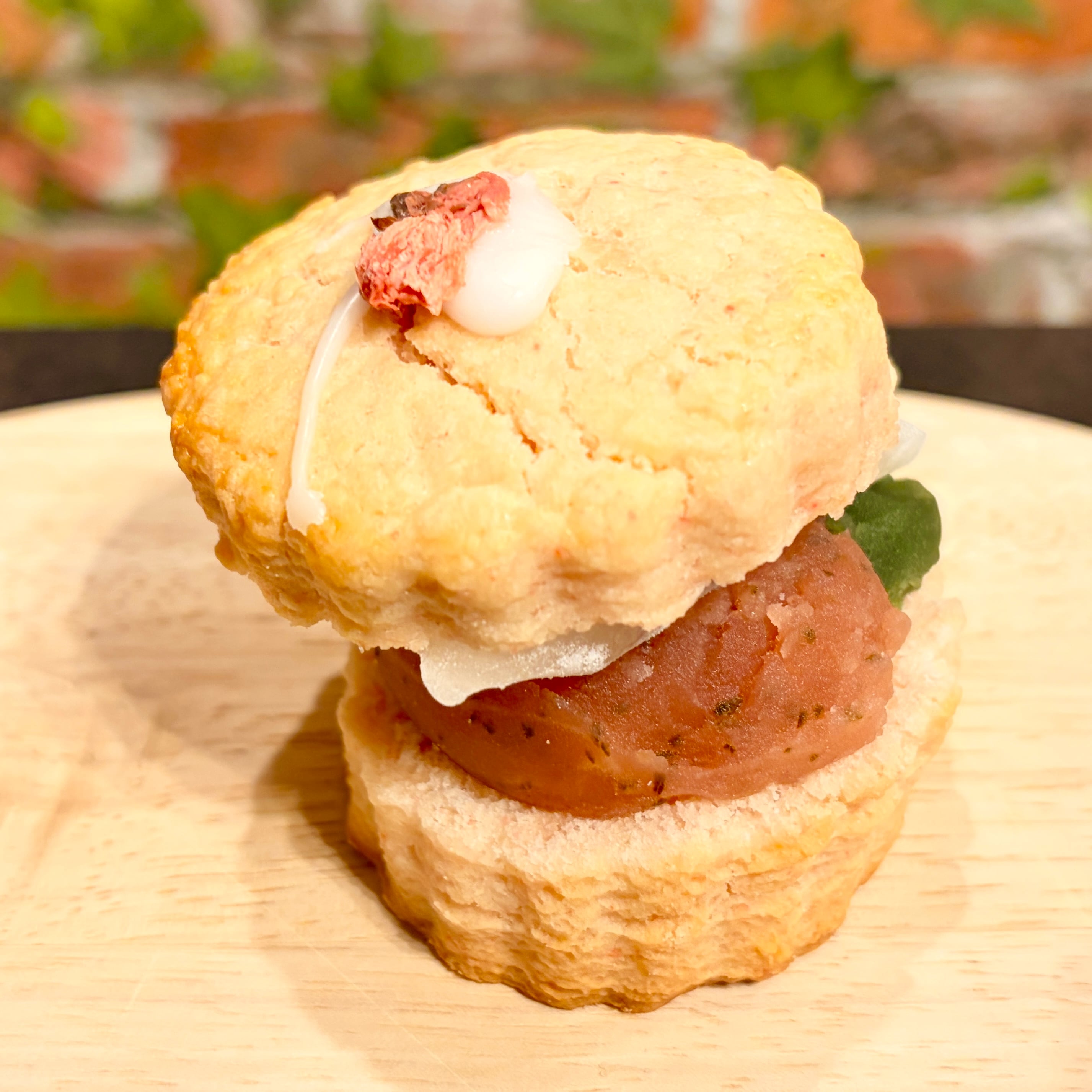 ●桜抹茶もちスコーンサンド・・・桜風味のスコーン生地に桜あん、抹茶あん、ぎゅうひをサンドしました。桜の風味と抹茶のあじわい、もちもちのぎゅうひの食感が楽しい春らしいスコーンサンドです。