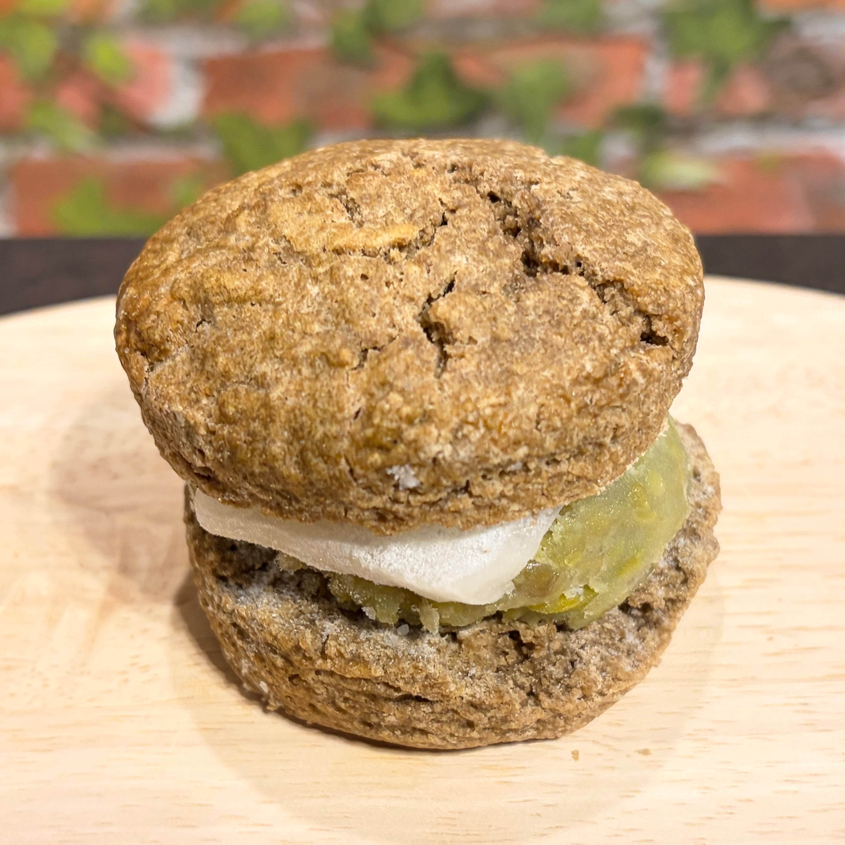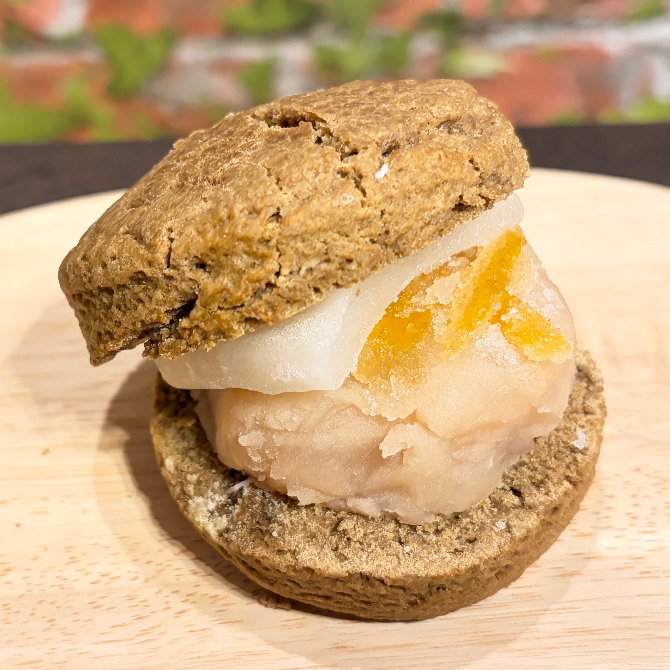 ●ほうじ茶文旦もちスコーンサンド・・・ほうじ茶スコーン生地に大手亡豆白あんとぎゅうひ、特製文旦ピールをサンドしました。ほうじ茶の味わいにまったりとした甘みの白あんにもちもちのぎゅうひ、ピールの爽やかさがおいしい文旦大福のような味わいのスコーンサンドです。